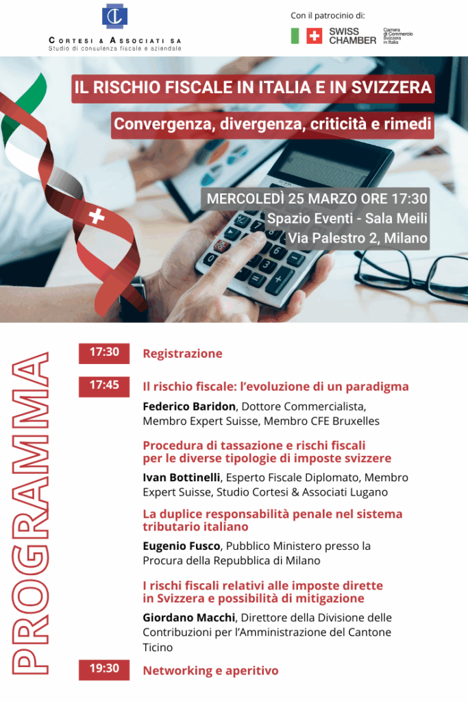 L’evento, organizzato dal Dott. Federico Baridon assieme allo Studio Cortesi & Associati Lugano con il patrocinio di Swiss Chamber, sarà dedicato al tema del rischio fiscale in Italia e in Svizzera, con l’obiettivo di evidenziare convergenze e divergenze nel contesto attuale e prospettico.