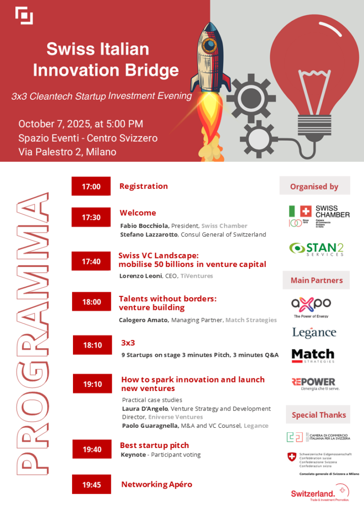 Quarta edizione dell’annuale evento dedicato all’innovazione e alle Startup organizzato da Swiss Chamber in collaborazione con Stan2services. Swiss Italian Innovation Bridge si terrà il 7 ottobre presso la Sala Meili, al terzo piano del Centro Svizzero alle ore 17.00.